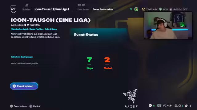 00:02:42Der Stream beginnt mit der unmittelbaren Vorbereitung auf das erste Cup-Spiel bei Sony. Der Streamer hat sich in diesem Rennen beteiligt, um FC Points zu gewinnen und einen Turniersieg anzustreben. Das Hauptziel ist, mit dem Gewinn von 500 Punkten den Kauf des teuren Season Pass zu umgehen, was eine erhebliche Ersparnis von 250.000 Münzen bedeuten würde.