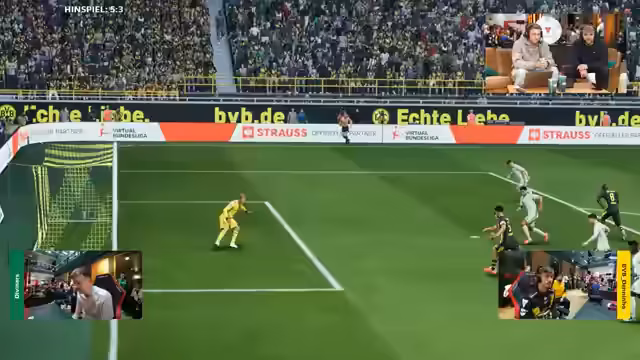 06:15:24Der BVB startet in den schwarz-gelben Trikots von links nach rechts, während St. Pauli in weißen Trikots agiert. Berkay Lion zeigt bereits nach kurzer Zeit eine starke Offensive mit einem Ballgewinn und direkter Vorwärtsbewegung. De Ninho kontert jedoch geschickt und erzielt das erste Tor mit einem perfekten Pass auf C. Roberto, der den Ball zum 1:0 für den BVB verwandelt. Ein bemerkenswerter Beginn des finalen Duells, das viel Versprechen zeigt.