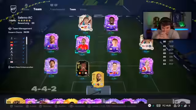 00:52:51Der Streamer reflektiert die komplexen Anforderungen der aktuellen SBCs und Cups. Das Hauptproblem ist der Mangel an einem starken Torhüter und einem besseren Stürmer. Währenddessen wird die hohe Kosten der benötigten Icons und Karten wie Bastoni oder Oliver Baumann kritisiert. Die anstehende Aufgabe, mit nur maximal zwei Toren durch deutsche Spieler auszukommen, stellt eine zusätzliche Hürde dar, die die taktische Planung beeinflusst.