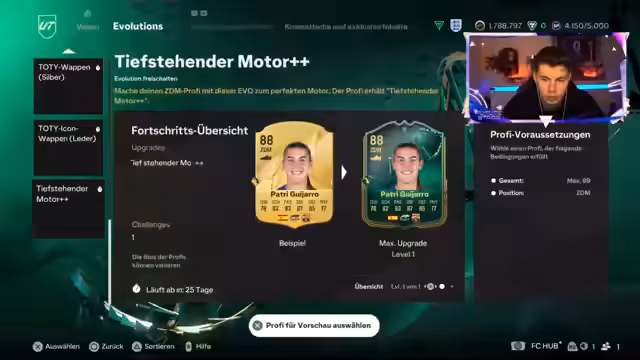 02:01:19Nach dem Öffnen mehrerer Packs wird ein 89er Spieler gezogen. Der Fokus der Unterhaltung und der Diskussionen liegt stark auf den "Evo"-Karten. Der Streamer zeigt sich beeindruckt von der Vielfalt der auf den Karten verfügbaren Playstyles und analysiert deren Potenzial. Er zieht nun Lamin Jamal als neuen Spieler und plant, diesen im Team zu integrieren. Der Fokus auf strategische Teamzusammenstellungen und das Potential von speziellen Spielkartenversionen bleibt im Vordergrund.