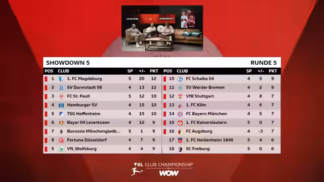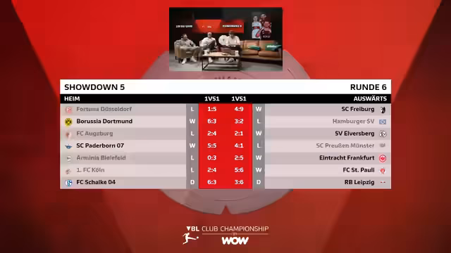 00:08:52Die fünfte Ausgabe des VBL Showdowns ist live von Düsseldorf aus gestartet, der Fokus liegt auf den finalen Entscheidungen der Saison. Es wird darüber entschieden, welche Teams die letzten Plätze für die Top 8, Top 10 und das Grand Final sichern und welche Teams in der Showdown-Phase ausscheiden. Die Stimmung ist geprägt von Spannung, da es der letzte Spieltag für viele Vereine ist, die sich nun auf die Showdown-Finale in Stuttgart vorbereiten.