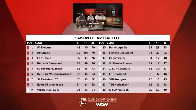 00:13:30Die aktuelle Gesamttabelle zeigt, dass sich Freiburg, Leipzig, FC St. Pauli, Borussia Dortmund und Bayern München bereits für das CEC-Finale qualifiziert haben. Die Top 5 der Tabelle haben sich über die gesamte Saison als sehr stabil erwiesen. Der Kampf um die Spitze ist dabei äußerst knapp, da nur sechs Punkte die Plätze eins bis fünf trennen. Das bedeutet, dass jede Mannschaft noch die Chance hat, sich das beste Seed für das Finale zu sichern, wobei es um das Recht geht, als erstes ins Finale einzuziehen und den potenziell schwächsten Playoff-Gegner zu bekommen.