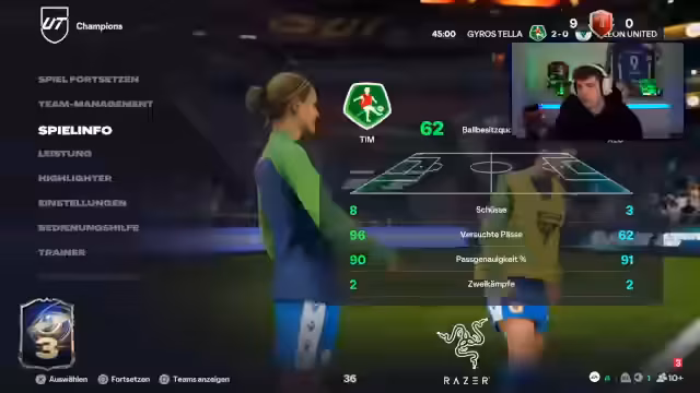 00:37:19Die Weekend League beginnt. Der Streamer ist optimistisch, stellt aber fest, dass das Team durch die vielen Chemieprobleme im Spiel nicht leichtfüßig agiert. Er kritisiert, dass die TOTY-Icons im Gegensatz zu anderen Karten keine Cam-Stats bieten, was das Einbauen erschwert. Er erwähnt das erste Spiel, in dem er trotz starker Gegner mit 4-0 gewinnen konnte, und ist gespannt auf die weiteren Partien, besonders gegen bekannte Gegner wie Tom.