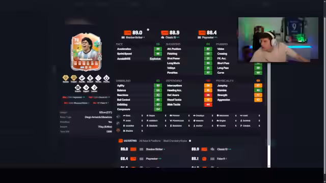 02:03:13Der Streamer plant, Maradona als nächste Evolution zu leveln. Er analysiert dessen Stats und überlegt, welche Playstyles ihm geben könnte. Er entscheidet sich gegen Raserei und für Low Driven. Es wird erwähnt, dass Physis aktuell fehlt und es schwierig ist, diese Stat zu erhöhen. Dennoch kann Maradona mit Stats wie 99 Übersicht, 99 Passen und 99 Schieben aufgewertet werden, was ihn zu einer potenten Karte im Angriff macht.