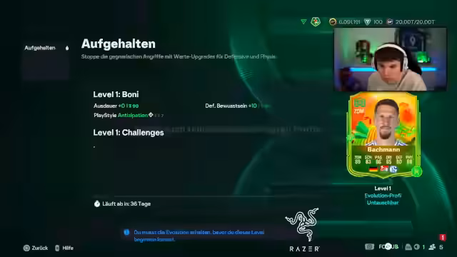 00:03:27Der Streamer analysiert die aktuellen Team of the Year SBCs und Evo-Karten. Er konzentriert sich speziell auf eine Abwehr-Evo, die nur auf Bronzespielern verwendet werden kann, welche innerhalb von sieben Tagen abläuft und wichtige Attribute wie Defensivbewusstsein plus 20 und Tiki-Taka verleiht. Er diskutiert die Nutzung dieser Karten für sein Team und welche Spieler davon am meisten profitieren würden, wie zum Beispiel den Mittelfeldspieler Mauro Salazar.