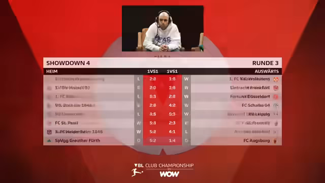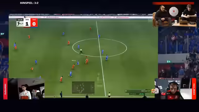 03:55:25Der Streamer erklärt, warum das Showdown-Finale an einem Montag stattfindet und spricht von einer sehr schwierigen Qualifikationsphase. Er gibt zu, die Quali nicht zu Ende gespielt zu haben, aus mentaler Überforderung. Anschließend werden die ersten VBL-Spiele des Tages gestartet. Furky gibt für Bayern gegen Lautern einen guten Start mit einem 2:0. Der Streamer analysiert Furkys Spielstil und stellt fest, dass dieser meist gewinnt, wenn er als erstes spielt. Er ist der Meinung, dass Lautern nur zu gewinnen braucht. Auch bei den Mainzern gibt es einen guten Start mit einem 1:0 durch einen Elfmeter.