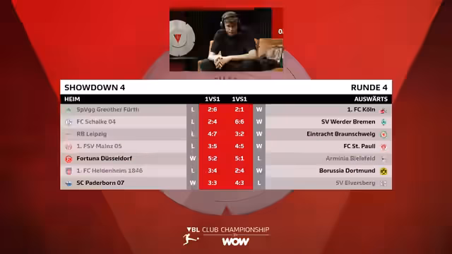 04:40:16Die aktuelle Tabelle des VBL-Showdowns wird vorgestellt. Nach der ersten Runde sind Leverkusen und der FC St. Pauli die führenden Teams mit drei Siegen. Weitere Teams wie Wolfsburg und Stuttgart haben ebenfalls starke Starts hingelegt. Der Streamer prognostiziert, dass die konstantesten Teams aus der Top 10 in Berlin antreten werden. Es werden die verbleibenden Spiele für einige Teams wie Wolfsburg und Hannover als entscheidend für die Qualifikation bezeichnet. Die Spannung für die kommenden Runden, insbesondere am Dienstag, wird hervorgehoben.