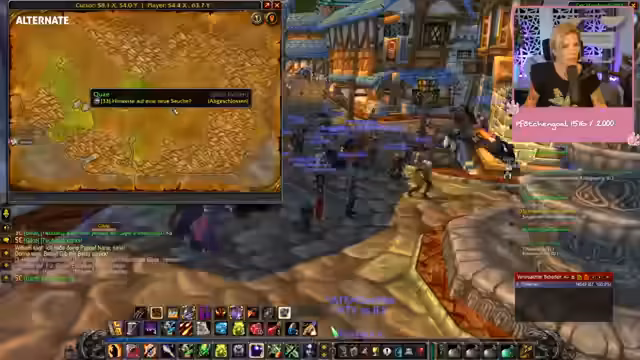 00:52:06Der Streamer konzentriert sich auf den Fortschritt im Spiel World of Warcraft, führt Quests durch, wie die Light of Elune-Quest, und sucht nach Kochrezepten. Dabei wird er mehrmals von seiner neugierigen Katze Ginny unterbrochen, die sich ins Stream-Setup drängt. Der Chat interagiert aktiv, indem er Tipps zum Gaming gibt, über persönliche Themen wie Krankheiten spricht und der Streamer auf Kommentare und Anfragen der Zuschauer eingeht.