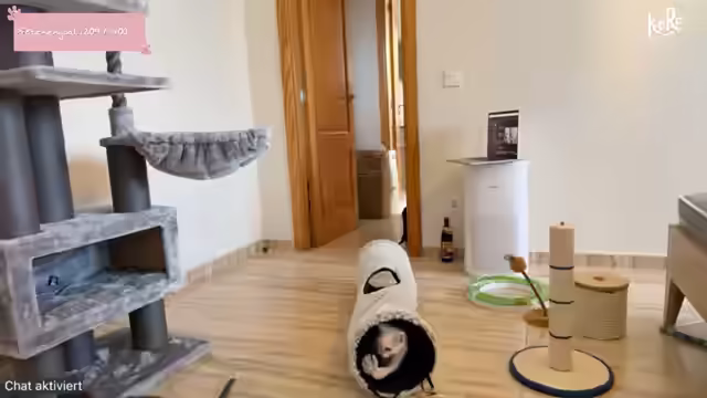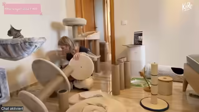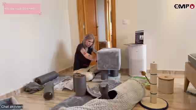02:27:28Die Streamerin gibt Empfehlungen für Kratzbäume der Marke Rufi, die sie besonders für Norwegische Waldkatzen als langlebig und stabil empfiehlt. Der Grund, warum sie im Stream keine Rufi-Kratzbäume verwendet, ist die längere Lieferzeit von vier bis fünf Wochen. Es wird festgestellt, dass Kratzbaum Nummer zwei fast fertig zusammengebaut ist. Ein Teil, der noch fehlt, gehört eigentlich zu diesem Kratzbaum und kann gewaschen werden, wenn er schmutzig ist. Die Streamerin beginnt mit dem Zusammenbau des nächsten Kratzbaums und bemerkt, dass sie durch die vorherigen Aufbauten geübter ist und die Anweisungen, von oben nach unten zu bauen, nun besser beachtet.