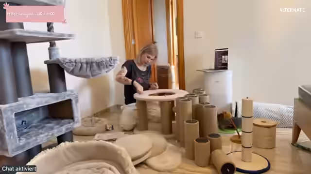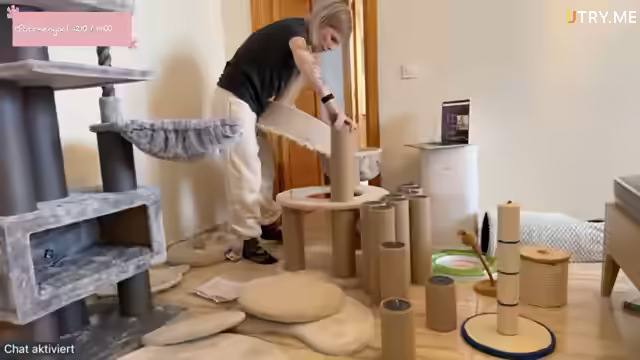 01:57:32Es wird mit dem Zusammenbau des ersten Kratzbaums begonnen, einem Modell mit mehreren Elementen. Die Teile werden identifiziert, darunter ein Stamm mit Ball (Teil 10) und Stämme ohne Ball (Teil 9). Es wird festgestellt, dass die Stämme ohne Ball zweimal benötigt werden. Der Ball soll eigentlich nach unten zeigen, aber die Streamerin findet es optisch ansprechender, ihn nach oben zu montieren. Die Schwierigkeit des Zusammenbaus wird humorvoll kommentiert und die Notwendigkeit von zwei Personen für den Aufbau wird festgestellt, obwohl die Anleitung dies nicht erwähnt. Die Katzen werden kurz rausgelassen und wieder hochgelassen, während die Streamerin sich in Ruhe dem Zusammenbau widmet. Es wird erwähnt, dass die Innenseiten zum Kratzbaum passen, was bei der Auswahl berücksichtigt wurde.