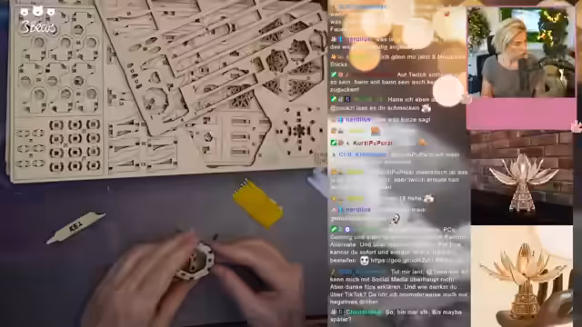 00:24:08Nach den privaten Neuigkeiten beginnt der eigentliche Tinkering-Teil des Streams. Das zu bauende Projekt, eine „Feuerblume“ von Magic Holz, wird vorgestellt. Der Streamer bewirbt das Produkt, das normalerweise 119 Euro kostet, und gibt einen Rabattcode an, der den Preis auf unter 80 Euro senkt. Der Bau des ersten Teils des Sets beginnt, wobei der Fokus auf der Montage der Basis und der ersten elektronischen Komponenten liegt. Der Prozess wird als eine Form der gemeinsamen Aktivität mit der Community beschrieben, bei der auch gequatscht und Musik gehört wird.
