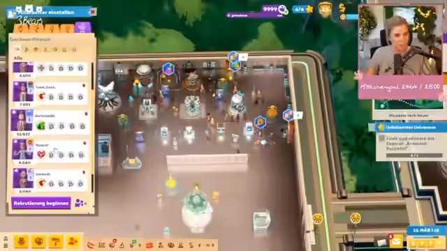 02:56:30Der Fokus verlagert sich auf das Management der Mitarbeiter im Spiel. Der Streamer spricht von einem negativen Event, bei dem alle Mitarbeiter krank werden, was er als wundervoll bezeichnet. Er versucht, aktuelle Aufgaben zu priorisieren, darunter das Entfernen von Höllenschimmelflecken und das Betreten der Hauptstadt der Unterwelt. Dabei klagt er über die Unübersichtlichkeit der Aufgaben und seine eigene Überforderung durch die vielen parallel laufenden Aktionen.