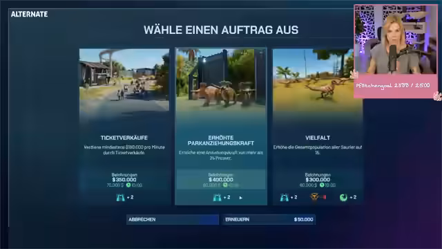 01:24:48Der Stream wechselt zum Spiel Jurassic World Evolution 2. Es wird eine neue Insel in Las Vegas erkundet. Ziele sind das Zähmen von Dinos, Erforschen von Grabungsstätten und der Aufbau eines funktionierenden Parks. Es werden Probleme wie Reparaturen an Anlagen, Wartung und die Erfüllung von Aufträgen gelöst, um den Ruf zu verbessern und das Parkmanagement zu zeigen.