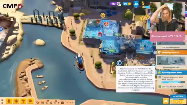 02:45:01Eine Inspektion durch die Bürgermeisterin steht bevor, die eine hohe Bewertung des Museums erwartet. Die Begeisterung muss von 3.900 auf 4.600 gesteigert werden. Dafür werden Projekte gestartet, wie das Platzieren von Schwimmgabeln. Die Steuerung von Sicherheitspersonal gegen Diebe ist eine ständige Aufgabe. Der Streamer arbeitet hart, um die Inspektur zu bestehen, während er parallel die persönlichen Sorgen um seine kranke Katze und die anstehende Baustelle erwähnt.