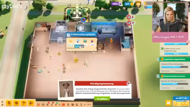 01:40:01Der Betrieb des Museums erfordert ein effektives Personalmanagement. Botanik-Experten müssen Pflanzen gießen, während Hausmeister Toiletten reparieren und aufräumen. Mitarbeiter werden gefeuert, weil sie ihren Aufgaben nicht nachgehen, während neue eingestellt werden. Die Begeisterung der Gäste ist zentral und wird durch die Platzierung von Exponaten wie einer Büste von Roderick und die Vervollständigung des Mosaiks angestrebt. Der Umgang mit überfüllten Mülleimern und das Management der Ressourcen sind ständige Herausforderungen.
