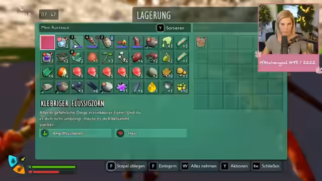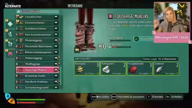 03:19:57Ein zentrales Thema des Streams ist das Sammeln von Materialien für Rüstungen und Waffen. Der Streamer benötigt unter anderem Seidenseile, Preiselbeerleder, Milbenpelze und Käfergummi. Dabei werden verschiedene Stellen im Spiel besprochen, an denen diese Materialien gefunden werden können. Auch die Herstellung von Saft und anderen Tränken wird behandelt, die für bestimmte Rezepte notwendig sind. Der Streamer zeigt sich dabei darüber frustriert, dass die benötigten Materialien an manchen Stellen nicht auffindbar sind oder durch Bugs das Sammeln erschwert wird.