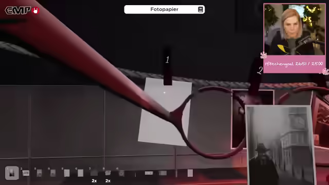 03:51:39Ein Safe mit einem Zahlenschloss wird entdeckt, dessen Kombination durch Hinweise an der Wand gefunden wird. Im Safe befindet sich eine Box, die ebenfalls mit einem Zahlenschloss gesichert ist. Die korrekte Zahlenkombination wird durch das Betrachten von Reifenabdrücken und zugehörigen Wappen verschiedener Automarken ermittelt. Nach dem Öffnen der Box wird ein weiterer Schnipsel für eine Nummer gefunden. Anschließend wird ein Raum mit einem Radio erkundet, bei dem durch das Einstellen bestimmter Frequenzen ein Schlüssel und eine Box gefunden werden. Die Box enthält Reifenspuren. Danach wird eine Dunkelkammer betreten, in der sich ein kaputter Entwickler, Fotos, eine Zange, Schalen, ein Korb und Filme befinden. Ziel ist es, die Filme zu entwickeln, wofür ein Hebel und Developing Photo Paper benötigt werden. Es wird festgestellt, dass der Entwickler leer ist und Chemikalien benötigt werden, die selbst zusammengemischt werden müssen. Die korrekte Mischung besteht aus 50% C6H6O2 und 50% Na2S2O3.