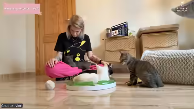 01:48:41Es werden Fortschritte bei der Eingewöhnung der Katzenkinder Herminchen und Pumpkin hervorgehoben. Herminchen lässt sich bereits streicheln und schließt dabei die Augen, was als großer Fortschritt gewertet wird. Pumpkin hat an Gewicht zugelegt und macht einen kräftigen Eindruck. Die Streamerin erwähnt, dass sie Herminchen und Dobby mit Churros bestechen könnte, um sie näherzubringen. Es wird auch die Ähnlichkeit zwischen Sanji und Dobby betont, die Geschwister sind. Die Quarantäne für die drei Katzenkinder ist notwendig, da sie mit Katzenschnupfen angekommen sind und Pumpkin noch Augenprobleme hat. Zudem hatte Pumpkin schlimmen Durchfall, weshalb eine Zusammenführung mit den anderen Katzen noch nicht möglich ist. Die Streamerin verlässt kurz den Raum, um sich Essen zu machen, und ist zuversichtlich, dass Herminchen in ihrer Abwesenheit aus ihrem Versteck kommen wird. Währenddessen schaut sie ein kurzes YouTube-Video über Proteinreiche Ernährung.