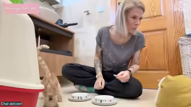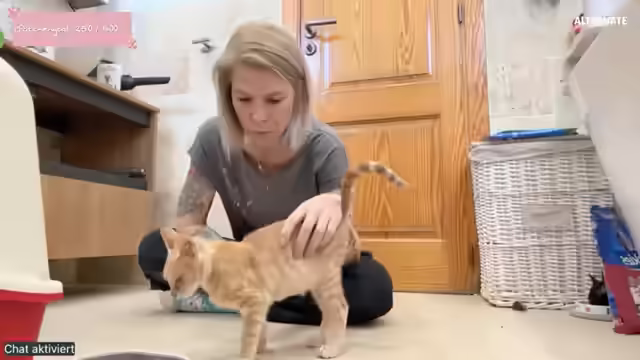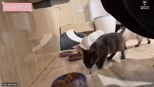 00:14:24Es wird angekündigt, dass die Zuschauer gleich zu den Kätzchen mitgenommen werden, wobei zuerst die größeren Kätzchen gefüttert wurden, die kleineren jedoch noch nicht. Die Streamerin wechselt zur Katzenszene, um den Sound zu testen und den Zuschauern die Möglichkeit zu geben, den Sound aus dem Handy zu beurteilen. Nach positivem Feedback beginnt die Morgenroutine mit den Kätzchen. Zuerst werden die Kätzchen begrüßt und es wird gefragt, ob sie Hunger haben. Anschließend werden die Kätzchen, die Antibiotika benötigen (Herr Mähnchen und Dobby), mit einer Mischung aus Churro und Antibiotika gefüttert. Besonderes Augenmerk liegt darauf, dass Pumpkin, der sehr futterneidisch ist, nicht an die Antibiotika gelangt. Nachdem die Antibiotika verabreicht wurden, wird das Frühstück für die Kätzchen vorbereitet, inklusive speziellem Tierarztfutter für sensible Bäuchlein und Darmpulver.