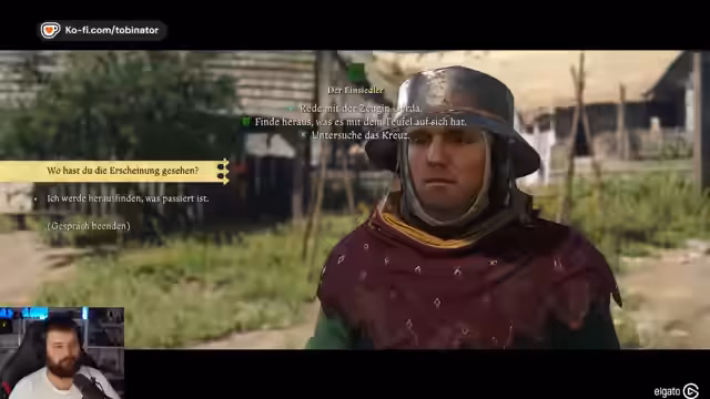 04:16:22Die Suche nach einem Zeimen führt den Streamer zu einem Bewohner, der von einer teuflischen Erscheinung, einem schwarzen Reiter, berichtet. Diese Begegnung löst eine neue Quest aus, die den Streamer zum Einsiedler Ambrosius führt. Auf dem Weg dorthin wird die Erzählung des Zeugen detailliert: Ein schwarzer Reiter mit leuchtenden Augen ist in Richtung Felsen geritten. Dies deutet auf eine tiefere, mysteriöse Geschichte hin, die nun erforscht werden muss.