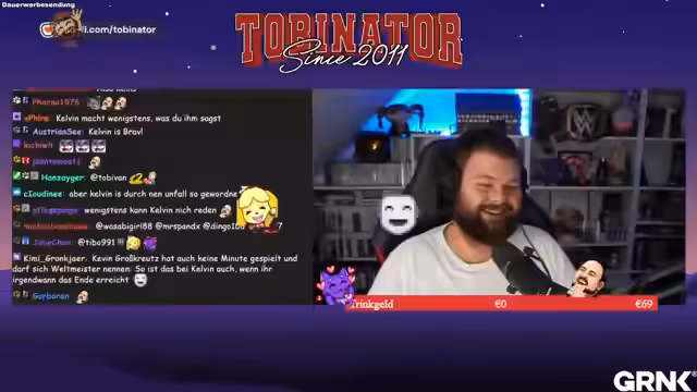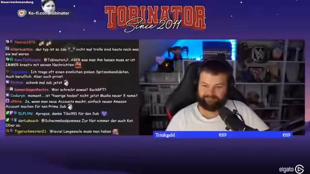 01:23:11Es gibt eine längere Phase der Interaktion mit dem Chat, bei der ein kreativer, aber als "langweilig" empfundener Name thematisiert wird. Ein Bot mit dem Namen Musa/Trigöden/Geoden fragt eine provokante Frage, die Streamer verwirrt. Er bittet den Nutzer, sich anzumelden und einen Sub zu hinterlassen, und lacht über einen weiteren User, der als "notgeil" bezeichnet wird. Danach geht die Danksagungsphase weiter, mit besonderer Erwähnung für Celia91 für 84 Monate (7 Jahre).