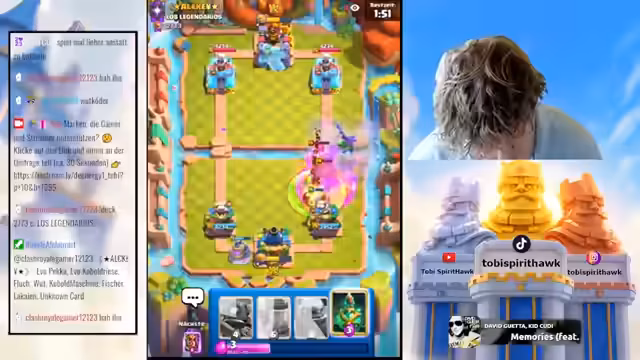 00:03:38Die Gaming-Session konzentriert sich auf Clash Royale, mit dem Ziel, zwei Accounts auf 3000 Trophäen zu bringen. Der Streamer erwähnt, dass er mit einem anderen Account bereits in El Salvador Top platziert ist. Es folgt eine intensive Gameplay-Phase, in der verschiedene Matches gespielt und die aktuelle Position in der Weltrangliste diskutiert wird.