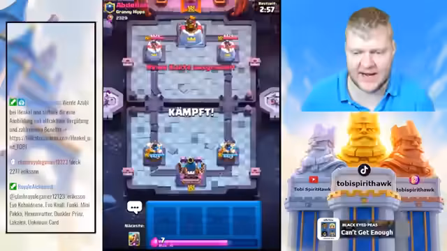 00:10:42Der Streamer startet den Ladder-Push in Clash Royale und entscheidet sich für das Golem Healer Deck, das er bereits in der 20 Win Challenge erfolgreich eingesetzt hat. Er vergleicht sein Deck mit dem des Gegners, der ebenfalls ein Golem-Deck spielt und einen besseren Start hat. Es folgen mehrere Matches, in denen er auf verschiedene Decktypen trifft, darunter Königsriese und Mortar Lightning. Er äußert Frustration über bestimmte Matchups, insbesondere gegen Mortar Lightning und X-Bow, die er als schwierig und 'No-Skill-Decks' empfindet. Trotzdem analysiert er die Spiele und versucht, die besten Strategien zu finden, um seine Gegner zu besiegen.