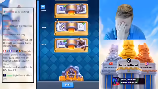 02:11:10Der Streamer reflektiert über eine verlorene Partie, die er der Community zuschreibt, und diskutiert die suboptimalen Kartenpicks. Insbesondere wird die Wahl der Hexe gegen Lightning als schwierig empfunden und die Entscheidung, Bogenschützen anstelle von Fledermäusen zu wählen, im Nachhinein kritisiert. Es folgt eine Auseinandersetzung mit einem Gegner, der den Kanonier als Turm gewählt hat, was als nachteilig gegen Skelette angesehen wird. Die Diskussion weitet sich auf Fußballprognosen aus, wobei der Streamer seine persönliche Meinung zu Bayern München und Borussia Dortmund teilt, basierend auf Erfolgen und finanziellen Aspekten, obwohl er sich nicht als Fußballexperte sieht. Die Frage nach der Verwendung von Elite-Jokern wird als komplex eingestuft, da noch keine genauen Informationen über deren Wert vorliegen.