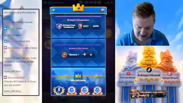 04:11:22Das Turnier ist beendet, und der Streamer gratuliert Soka zum ersten Platz, Ben zum zweiten und Felix zum dritten Platz. Er bedankt sich bei den Teilnehmern für die spannenden Turniere, erwähnt aber, dass er am Ende etwas die Konzentration verloren hat und keine weiteren Turniere mehr spielen möchte. Er bietet seinen QR-Code für Freundschaftsanfragen an, insbesondere für die Top-4-Spieler des Turniers. Obwohl er erschöpft ist, überlegt er, noch ein paar Ranglistenspiele in Clash Royale zu machen oder zu Brawl Stars zu wechseln, da die Ranked Season dort heute endet und er noch keine Ranglistenspiele gespielt hat. Er äußert seine Frustration über die Boss Bandit-Karte und andere Hardcounter, die sein Deck in Clash Royale stark beeinträchtigen. Trotz der Erschöpfung plant er, den Stream mit Brawl Stars fortzusetzen, da er dort noch Ranglistenspiele nachholen muss.