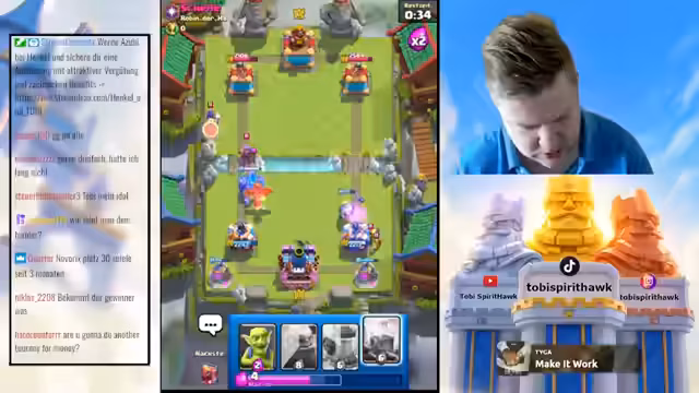 00:37:07Das erste Community-Turnier startet in wenigen Sekunden. Der Streamer wünscht allen Teilnehmern viel Glück und ist gespannt auf die gespielten Decks. Als Preis für den Gewinner werden Ruhm, Ehre und eventuell ein Platz auf seiner Freundesliste in Aussicht gestellt. Im ersten Match trifft der Streamer auf einen Gegner, der ein Golem-Elektrodrachen-Deck spielt. Er analysiert die Strategie seines Gegners und betont die Notwendigkeit, aggressiv zu bleiben, um einen großen Push zu verhindern. Trotz eines Fehlers am Ende gewinnt er das Spiel und geht in die nächste Runde des Turniers.
