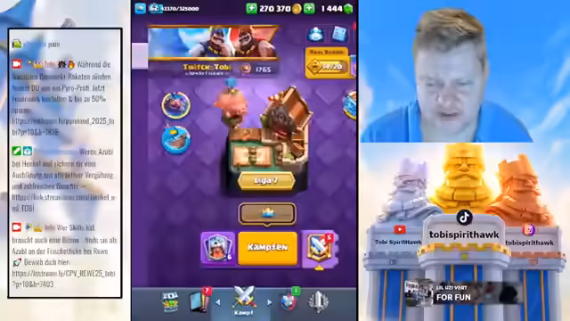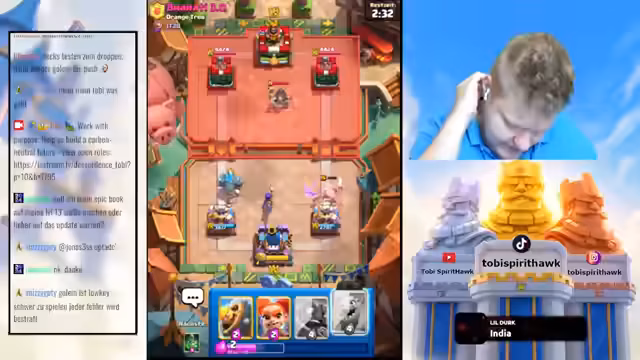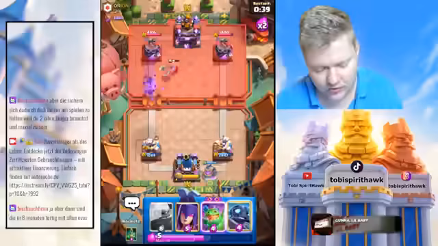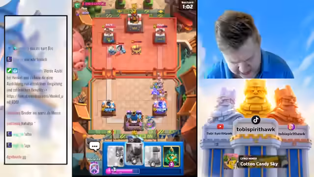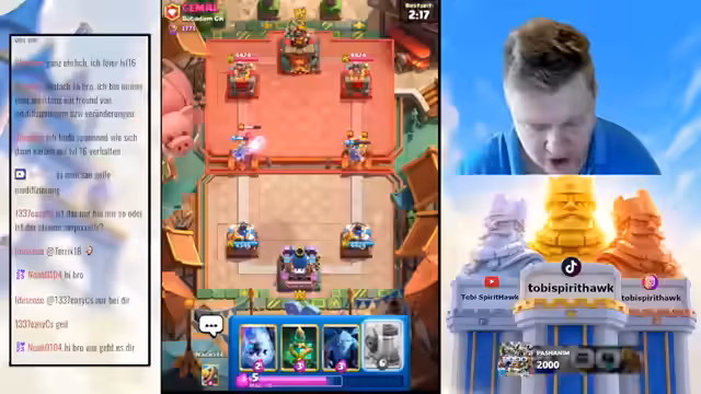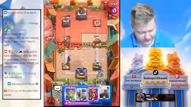 00:00:09Der Stream beginnt mit Begrüßungen und dem sofortigen Fokus auf das Spiel. Es wird schnell klar, dass das aktuelle Deck des Streamers Schwierigkeiten bereitet, insbesondere gegen bestimmte Kartenkombinationen wie Ankerpfeile ohne Zap oder Highscore. Die Rede ist von 'Elixiergolem' und dem Fehlen passender Gegenkarten, was zu einer frühen Niederlage führt. Es wird angedeutet, dass der Streamer eine längere Pause vom Livestreaming hatte, begründet durch mangelnde Zeit und Motivation, trotz finanzieller Möglichkeiten. Die Diskussion dreht sich um die Effektivität von Karten wie 'Ranken' und 'Bomben-Turm' und die Notwendigkeit, schnellere Karten zu spielen, um gegnerische Pushes abzuwehren. Der Streamer äußert Frustration über 'Evo-Skelette' und 'Drei Musketiere', die als schwach gegen bestimmte Konter beschrieben werden, was zu einem gefühlten '100-0 Matchup' führt.
