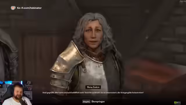 03:22:47In der ersten Stadt angekommen, sucht der Streamer einen Händler, um den angehäuften "Müll" loszuwerden. Bei der Schmiedin Rashida kann er seine Gegenstände verkaufen und reparieren lernen. Anschließend betritt er die Kriegergilde, wo er sich als Mitglied anmeldet. Er ist zunächst etwas enttäuscht, da die Gilde ihm keine unmittelbare Quest anbietet, und erkundet weiterhin die Stadt, auf der Suche nach weiteren Aktivitäten und Händlern.