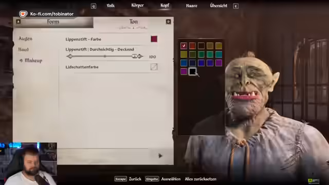 01:15:12Nachdem die technischen und organisatorischen Themen erörtert wurden, beginnt der Streamer endlich mit dem eigentlichen Gameplay. Zunächst muss er die Einstellungen anpassen, darunter die Lautstärke und die Grafikoptionen. Beim Charaktererstellungstool zeigt er sich begeistert von der Detailtiefe und erstellt seinen Ork 'Habsie'. Nachdem er im Tutorial-Gefängnis alle nützlichen Gegenstände wie Dietrich und Fackel an sich genommen hat, verlässt er seine Zelle, um die Spielwelt zu erkunden.