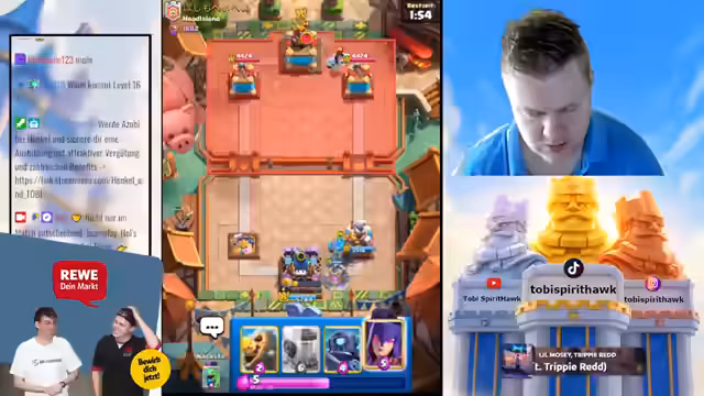 01:51:54Während eines laufenden Spiels wird die strategische Ausrichtung besprochen. Der Gegner spielt überraschenderweise das gleiche Deck wie der Streamer, was die Situation komplex macht. Trotzdem wird der Fokus auf die Lane gelegt und versucht, den Gegner durch gezielten Spam anderer Lanes zu kontern. Es folgt der Sieg, und der Streamer kommentiert das positive Ergebnis positiv. Er erwähnt auch wiederholte Vorschläge im Chat, bestimmte Karten wie den E-Bus zu kaufen, was er jedoch aufgrund des Preises ablehnt und seine eigene finanzielle Situation als 'Proki-Moki' beschreibt.