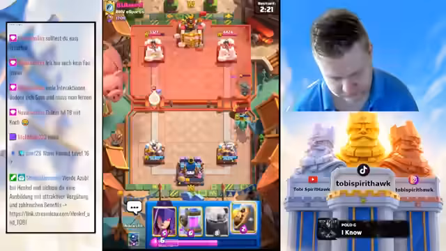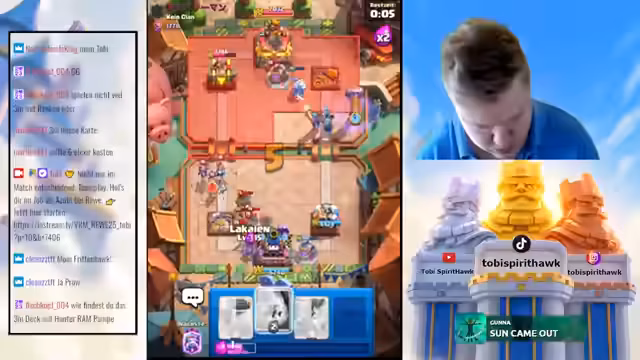 00:33:40Der Streamer bezeichnet Clash Royale für sich selbst als Arbeit, was ihn nicht zwangsläufig Spaß macht. Das Spielen ist ihm zwar wichtig, doch das Streaming selbst ist anstrengend. Während des Gameplays kommt es zu mehreren Fehlern und Missverständnissen, bei denen er sich über Gegner beschwert, die schlecht spielen, oder über Kartenzyklen, die ihm einen Sieg kosten. Trotzdem feiert er gelegentlich Gewinne und erreicht sein Ziel im Ranking.