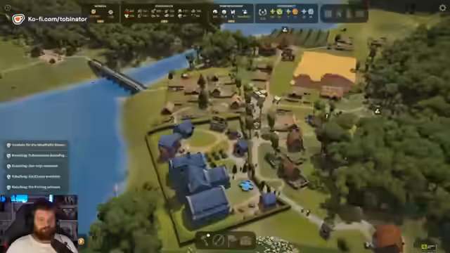02:44:24Der Streamer wendet sich dem Handel zu und erkennt bald ein Problem mit der Überproduktion von Ressourcen wie Hopfen. Um die Lager zu entlasten, wird ein neues Handelsmodell implementiert: ein fester Prozentsatz der Ressourcen wird behalten, der Rest wird an Händler verkauft. Gleichzeitig wird die Infrastruktur weiter ausgebaut; der Streamer plant eine Brücke, um beide Teile des Dorfes zu verbinden, und diskutiert die Anlegung von gepflasterten Hauptstraßen, um das Erscheinungsbild des Dorfes zu verbessern und die Effizienz zu steigern.
