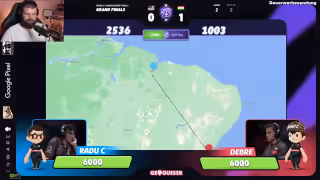 02:53:04Das Grand Final der Geoguessr-WM 2025 startet zwischen den beiden Top-Spielern Radu und Debrei. Das Match wird als Duell der Titans beschrieben, da beide Spieler im Turnierverlauf alle Matches souverän mit 3-0 gewonnen haben. Kommentatoren loben die hohe Qualität des Spiels und die strategischen Tiefe beider Kontrahenten, während das Match bereits von Beginn an sehr intensiv und ausgeglichen verläuft.