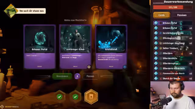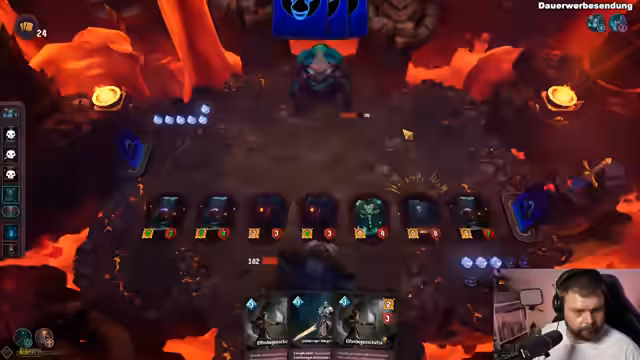 01:45:27Der Stream konzentriert sich intensiv auf das Spiel Doomspire. Der Spieler wählt verschiedene Karten und Diener wie Lichtbringer, Silberdorn und Bogenschütze, um gegen KI-Gegner zu kämpfen. Das Gameplay erfordert strategische Entscheidungen, welche Karten zu Beginn des Zuges ausgesucht und eingesetzt werden. Das Ziel ist es, immer wieder neue Level zu erreichen, wobei die KI-Gegner oft als sehr frech und übermächtig beschrieben werden, was den Frust des Streamers steigert.
