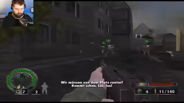 00:54:10Während des Spiels kommentiert der Streamer das Gameplay, das er für den Zeitpunkt gelobt, insbesondere im Vergleich zu anderen Spielen der Ära. Er kämpft sich durch eine Invasionsszene, wobei er auf die ungewohnte Steuerung und die mangelnde Sprintfähigkeit eingeht. Nach anfänglichen Schwierigkeiten gelingt es ihm, seine Kameraden zu retten und erste Missionsziele zu erfüllen, was zu einer Pause führt.