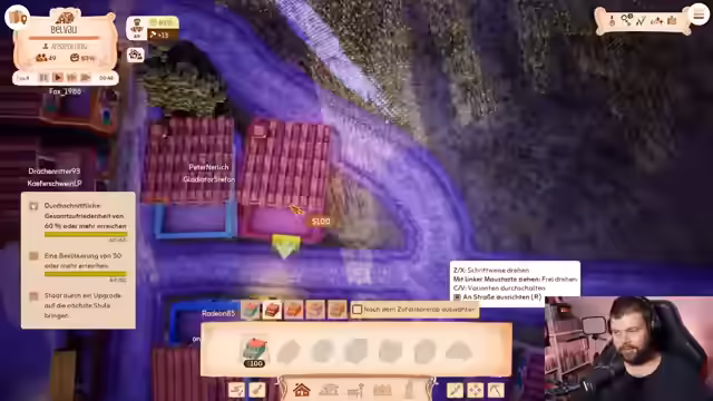 03:49:04Es wird eine neue Lagerhalle in der Nähe des Bahnhofs benötigt, um die Versorgung der Geschäfte zu gewährleisten. Trotz begrenztem Platz findet sich ein geeigneter Standort. Eine neue Familie zieht hinzu, was den Bau eines weiteren Hauses erforderlich macht. Zusätzliche Arbeitskräfte werden für die Lagerhalle eingestellt, um die Effizienz zu steigern. Die Häuser erhöhen die täglichen Einnahmen der zugehörigen Geschäfte, wobei die Dekorationsbewertung eine wichtige Rolle spielt. Es werden verschiedene Dekorationen wie Lampen und Bäume platziert, um den Marktplatz zu verschönern. Eine weitere Familie kommt an, was den Bedarf an zusätzlichen Wohngebäuden erhöht. Die Größe der Häuser wird angepasst, um den verfügbaren Platz optimal zu nutzen. Es wird festgestellt, dass der Fuchs sich wieder auf dem Marktplatz herumtreibt, vermutlich auf der Suche nach der noch nicht gebauten Taverne. Die Zufriedenheit der Bewohner wird angezeigt, wobei über 60% zufrieden sind. Ein Forschungszentrum wird gebaut, um die Stadt weiterzuentwickeln. Arbeitskräfte werden dem Fischstand zugewiesen, um die Produktion zu steigern. Ein Zaun wird versehentlich entfernt, aber schnell wieder aufgebaut. Ein kleiner Weg wird gebaut, um die Häuser mit dem Markt zu verbinden. Es wird festgestellt, dass eine Straße benötigt wird, um die Verbindung herzustellen.