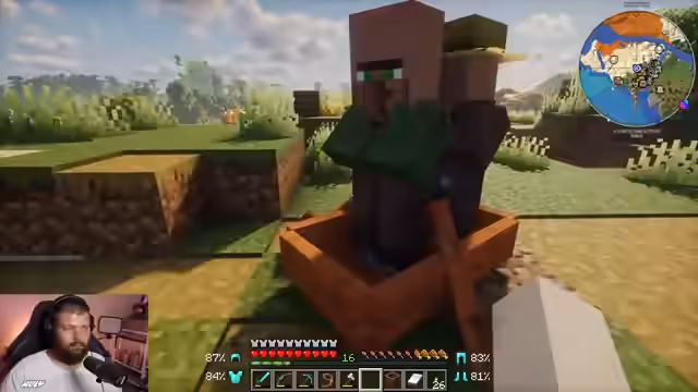 02:07:23Beim Bau des Dorfes greift der Streamer auf humorvolle und kreative Lösungen zurück. Da er keine Türen craften kann, überlegt er, ob die Dorfbewohner mit einer Leine gefangen werden können. Dies führt zu der Idee, Dorfbewohner umzusiedeln. Er versucht, einen Farmer mit dem Boot zu fangen und zu entführen, was durch Spielabstürze und unkooperative NPC-Verhalten erschwert wird. Der Prozess wird als Big Brother-ähnlich humorvoll inszeniert und mit dem Ziel verbunden, den Dorfbewohnern ein besseres Domizil zu verschaffen.