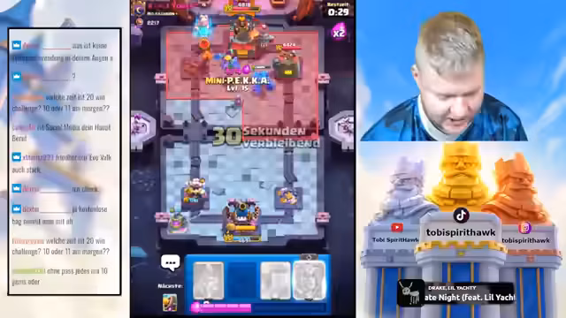 00:03:13Der Streamer stellt die anstehende 20-Win-Challenge vor, die für morgen um 11 Uhr angesetzt ist. Er äußert große Sorge und Nervosität, da er bisher immer 20 Siege geschafft hat und diesmal befürchtet, das Ziel zu verfehlen. Als potenzielle Decks für die Challenge werden das Golem-Deck und ein Rocket-Cycle in Erwägung gezogen, wobei die genaue Wahl noch offen ist. Das Motto lautet, bei Erfolg 20 Siege zu feiern, bei Misserfolg die Glatze rasieren zu lassen.