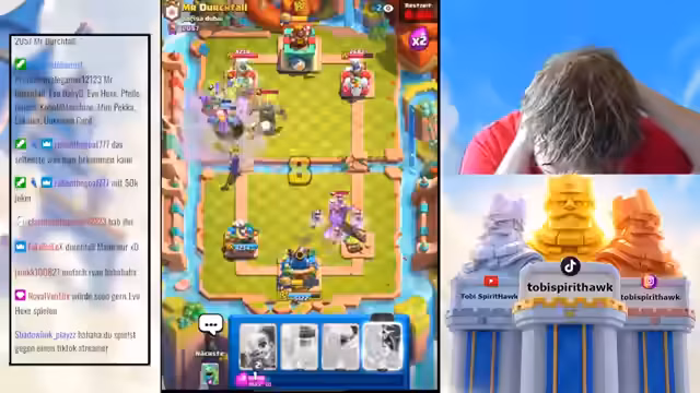 01:57:27Der Stream beginnt mit intensiven Clash Royale-Rankingspielen, bei denen der Streamer verschiedene Decks und Strategien testet. Er konzentriert sich auf Evo-Karten wie die Evo-Hexe und Evo-Balküre, während er über die Effektivität bestimmter Karten wie die Maschine diskutiert. Der Streamer zeigt seine frustration über einige Matchups, besonders gegen Full-Spam-Decks, und experimentiert mit Karten wie Mini-Packer, um gegen bestimmte Gegner besser dastehen zu können. Er betont die Wichtigkeit von Elixier-Management und Verteidigung in schwierigen Situationen.