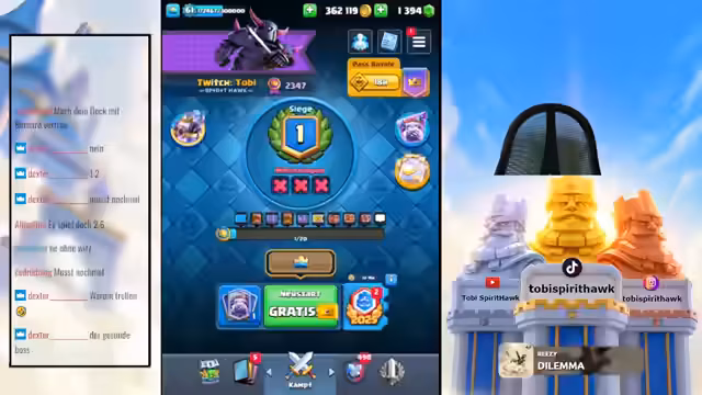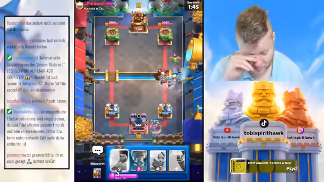 04:44:11Der Streamer reflektiert seine längere Pause im Spiel und die damit verbundenen Probleme. Er gibt an, durch die Abwesenheit von mehreren Jahren nicht mehr auf dem aktuellen Stand der Meta zu sein, was sich negativ auf seine Leistung auswirkt. Besonders die neuen Karten wie E-Booster, Truppen und Tower-Karten werden als herausfordernd beschrieben, da er sich mit ihnen nicht auskennt. Sein Versuch, mit einem Elektromagier-Deck die 20 Siege zu erreichen, verläuft zunächst schlecht, und er stellt fest, dass er spielerisch deutlich schlechter geworden ist. Er erinnert sich an seine frühen Erfolge, um den Kontrakt zu seinem jetzigen Zustand zu verdeutlichen.