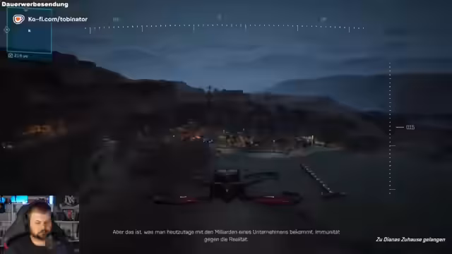 01:14:39Während der Verfolgungsjagd trifft der Charakter auf eine weitere Person und lernt Lars Okada kennen, den Chief Technology Officer von Silvercorp. In einem Dialog wird die Geschichte des Unternehmens und der Verbindung zu einer mysteriösen Person namens Hunter Morrison enthüllt, der das Implantat des Protagonisten entwickelt hat. Das Spiel etabliert dabei eine Cyberpunk-Ästhetik und ein umfassendes Worldbuilding, das den Streamer fasziniert. Er lobt die Atmosphäre und die Story, während spielerisch vor allem die Steuerung des Fahrzeugs und die Drohnen-Kontrolle im Mittelpunkt stehen.