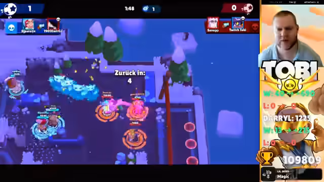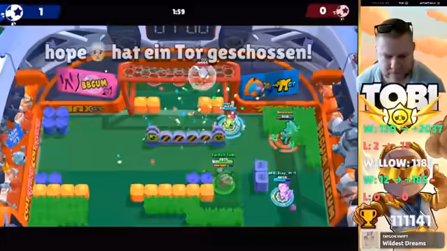 01:20:36Nach einem Verlust in der ersten Runde kommentiert der Streamer das unerwartete Tor und einen möglichen Bug. Trotzdem liegt der Fokus auf dem Push für Trophäen. Aktuell ist der Streamer Platz 8 in Deutschland und Platz 91 weltweit. Ziel ist es, auf Platz 4 in Deutschland vorzurücken, um im Leaderboard besser sichtbar zu sein. Die Taktik besteht darin, Brawler nur bis Level 400 zu pushen für schnellere Matches und dann zu wechseln, um so effizienter Trophäen zu sammeln.