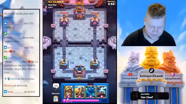 00:09:33Während des Streams werden mehrere Spiele mit dem neuen Golem-Deck gespielt. Nach anfänglichen Siegen folgen auch Niederlagen gegen schwierige Matchups wie X-Bogen oder Elektromagier-Spam-Decks. Der Streamer analysiert die Schwächen des Decks, insbesondere gegen schnelle Zyklus-Decks oder bestimmte Evo-Karten. Es gibt Diskussionen über die Performance des Decks und mögliche Anpassungen, wobei trotzdem insgesamt eine positive Grundstimmung zum Deck-Erfolg herrscht.
