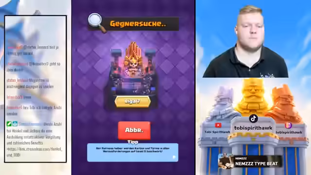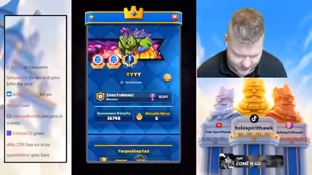 00:08:31Nach der Entscheidung für das neue Golem-Deck beginnt der Streamer sofort mit den Spielen. Der Fokus liegt auf der aggressiven Nutzung der Kartenvorteile, insbesondere des Golems, Prinz, Gold Knights und Evo-Geister. Die Spiele werden live kommentiert, dabei werden erfolgreiche Züge, wie ein schneller Gold Knight-Push oder der defensive Einsatz von Evo-Trackern, als 'geil' oder 'massiv' bezeichnet. Gleichzeitig werden aber auch Fehler und Fehlentscheidungen offen angesprochen, insbesondere bei der Gegenwehr von Decks wie dem Royal Giant.