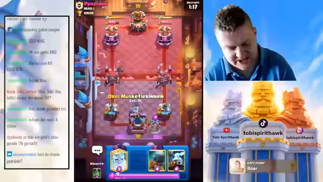 02:10:31Nach mehreren Runden und dem Test diverser Deck-Konfigurationen gelingt es dem Streamer, direkt am ersten Tag der neuen Season den Meilenstein von 15.000 Trophäen zu erreichen. Dieses Ziel wird im Finale mit einem selbst zusammengestellten Deck, das die neuen 3-Musketiere kombiniert, erreicht. Der Sieg wird als dramatischer Geisteskampf beschrieben, bei dem der Gegner durch ungewöhnliche Spielzüge wie die Platzierung von Tornados und Raketen auf den Turm verwirrt wird. Der Erfolg wird als massive persönliche Leistung gefeiert und demonstriert das Potenzial der neuen Kartenkombinationen.