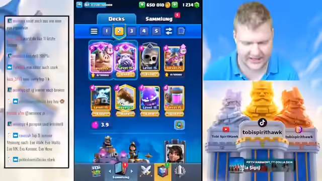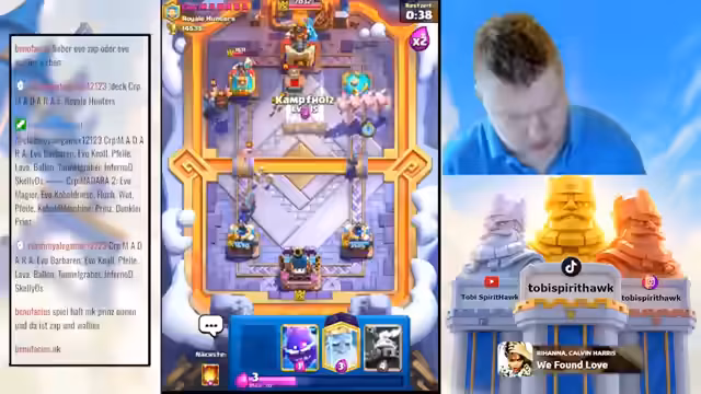 00:03:08Der Stream beginnt mit Begrüßungen und der Vorstellung der neuen Inhalte der Season 15K und UC Push. Der Streamer spricht über seine Einschätzung der neuen Evo Royal Hogs, die er anfangs als relativ schwach ansieht, aber dennoch direkt in ein Deck einbaut, um sie zu testen. Parallel dazu wird ein Deck mit den drei gebufften Musketierinnen (3M), der Elixierpumpe, Royal Ghost und Evo Royal Ghost zusammengestellt und erste Spiele mit dieser Kombination gestartet.